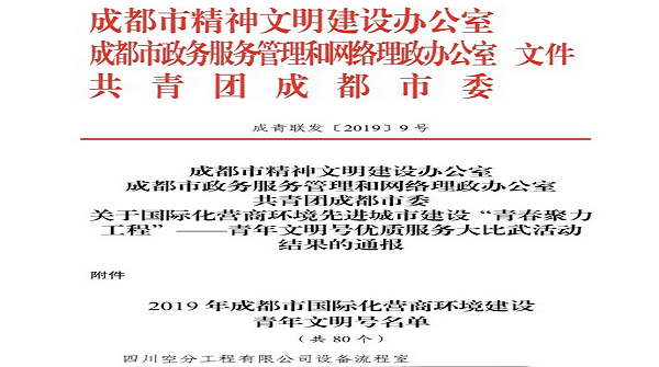 四川best365网页版登录集团工程有限公司装备流程室荣获“2019年成都会国际化营商情形建设” 青年文明号称呼