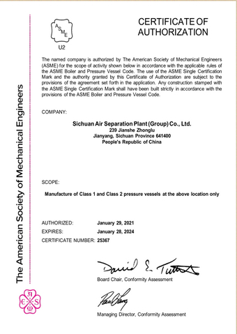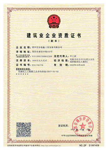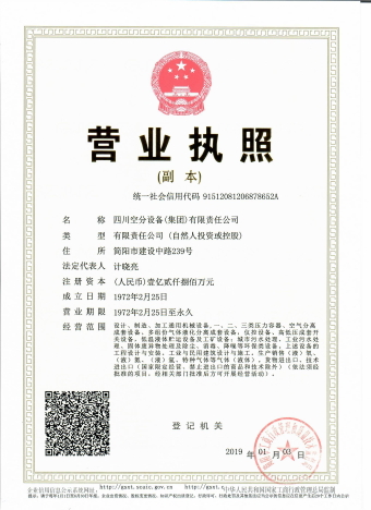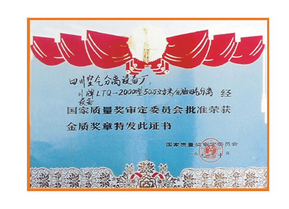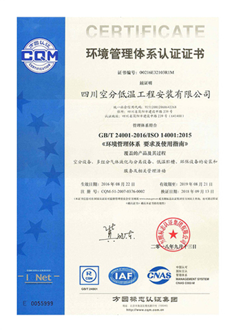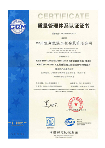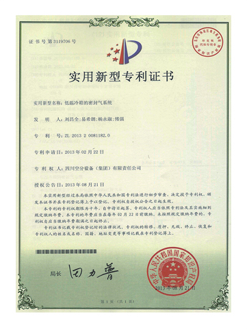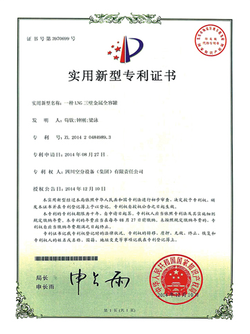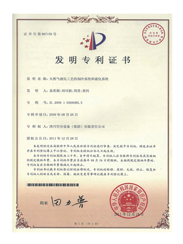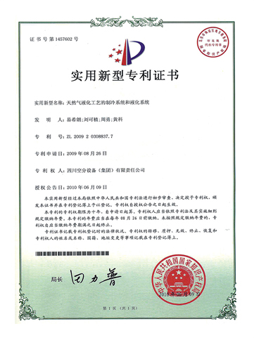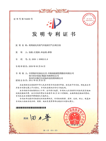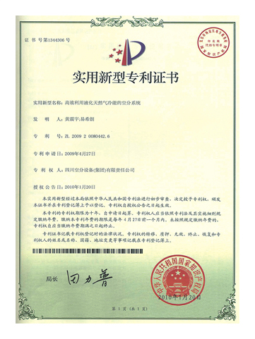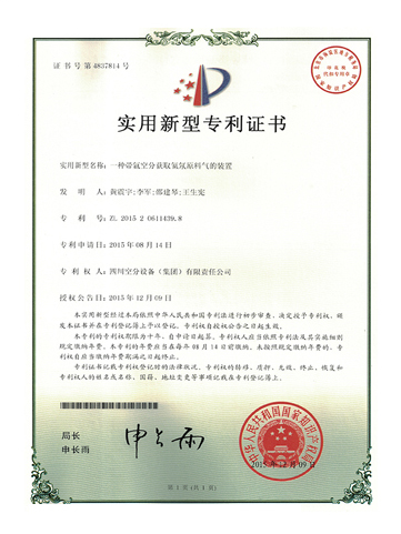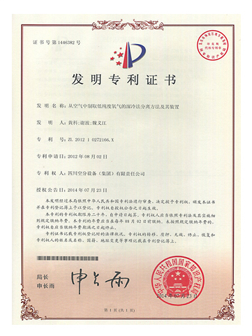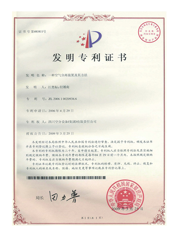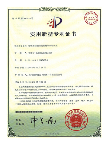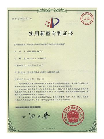 适用新型专利证书-从空气中制取低纯度氧气的深冷法疏散装置