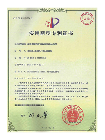 适用新型专利证书-板翅式换热器气液两相流均布装置