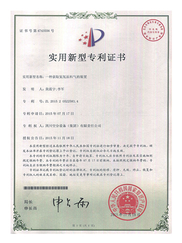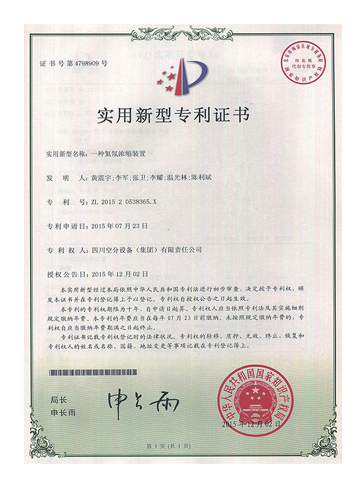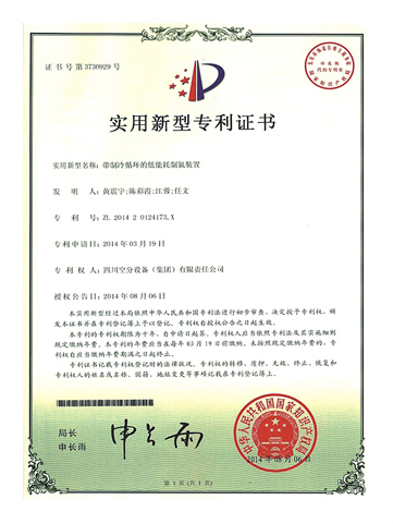 适用新型专利证书-带制冷循环的低能耗制氮装置