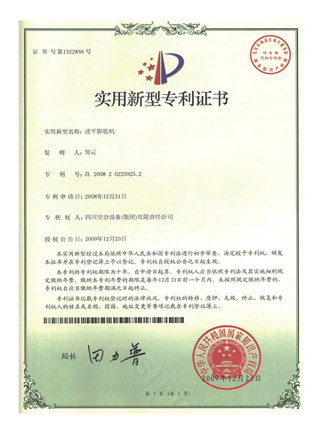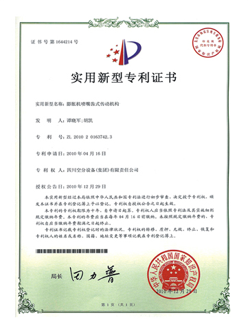 适用新型专利证书-膨胀机喷嘴齿式传念头构