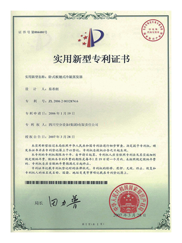 适用新型专利证书-卧式板翅式冷凝蒸发器