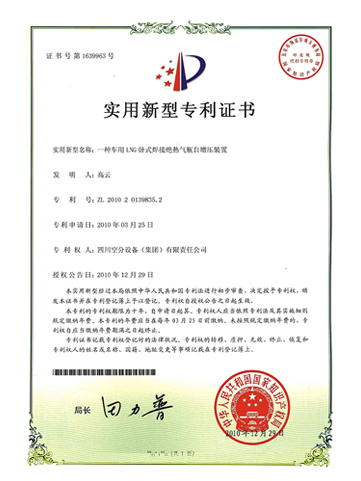 适用新型专利证书-一种车用LNG卧式焊接绝热气瓶自增压装置