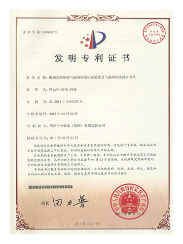 发明专利证书-板翅式换热器气液两相流均布装置及气液两相流混淆要领