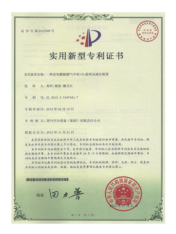 适用新型专利证书-一种富氧燃烧烟气中的CO?提纯及液化妆置