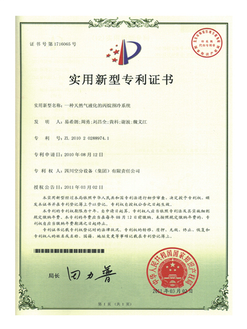 适用新型专利证书-一种自然气液化的丙烷预冷系统