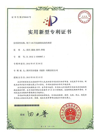 适用新型专利证书-用于LNG汽化器的高效传热管