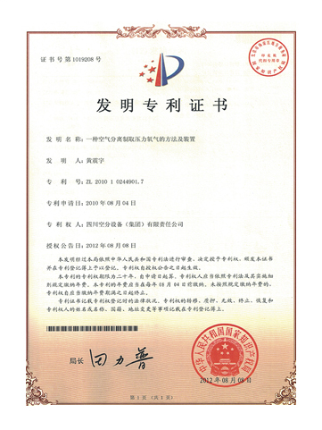 发明专利证书-一种空气疏散制取压力氧气的要领及装置